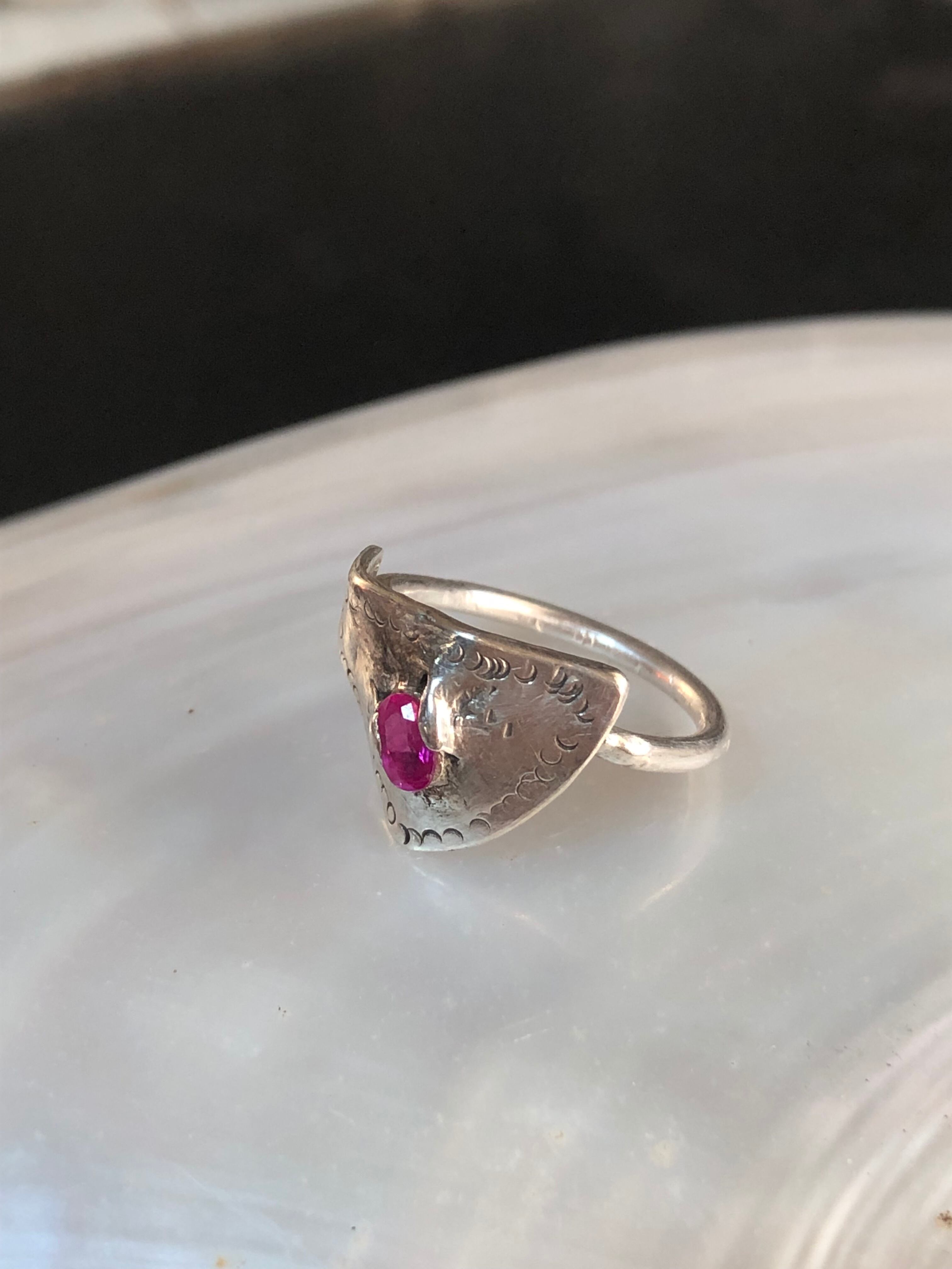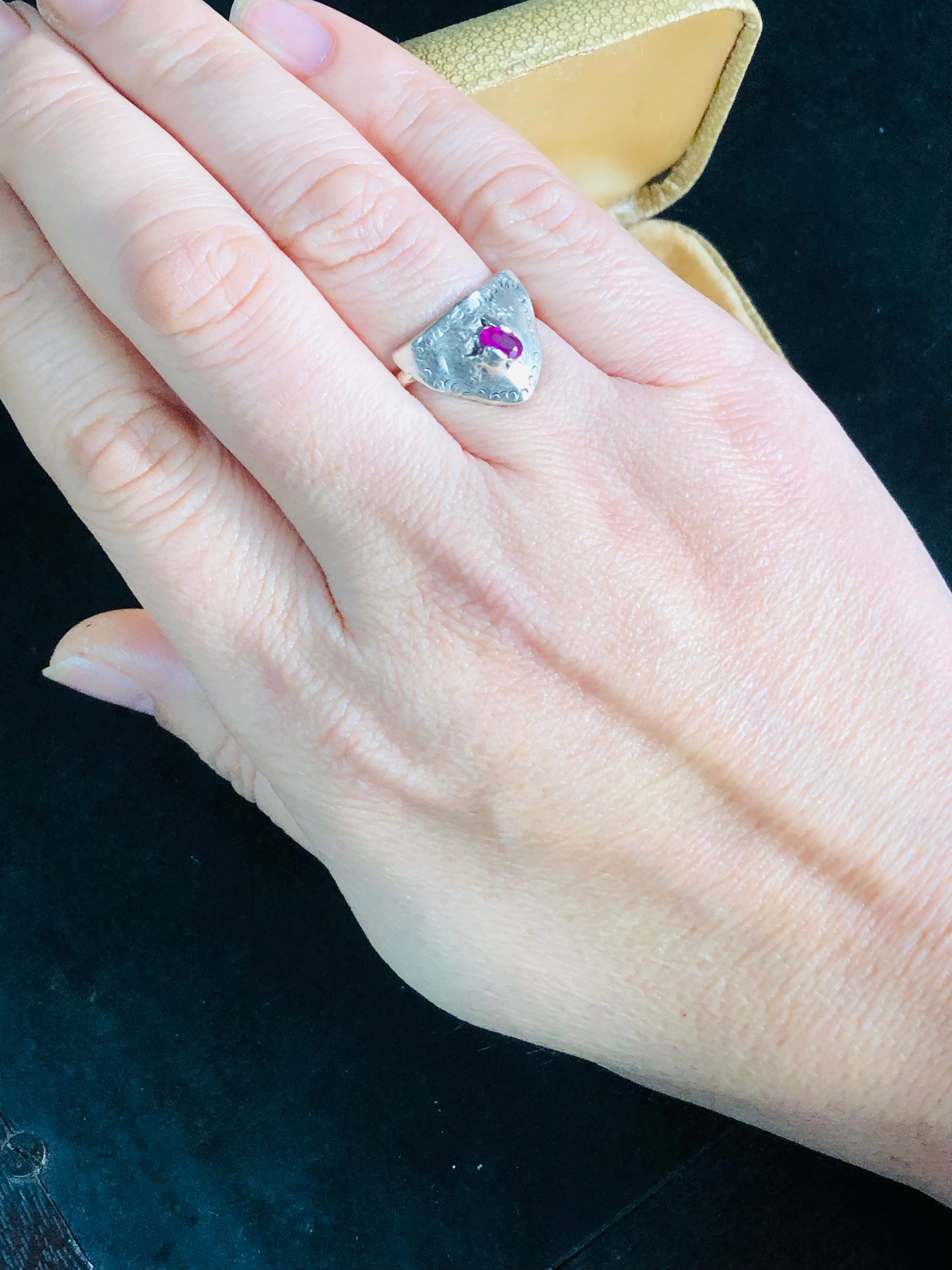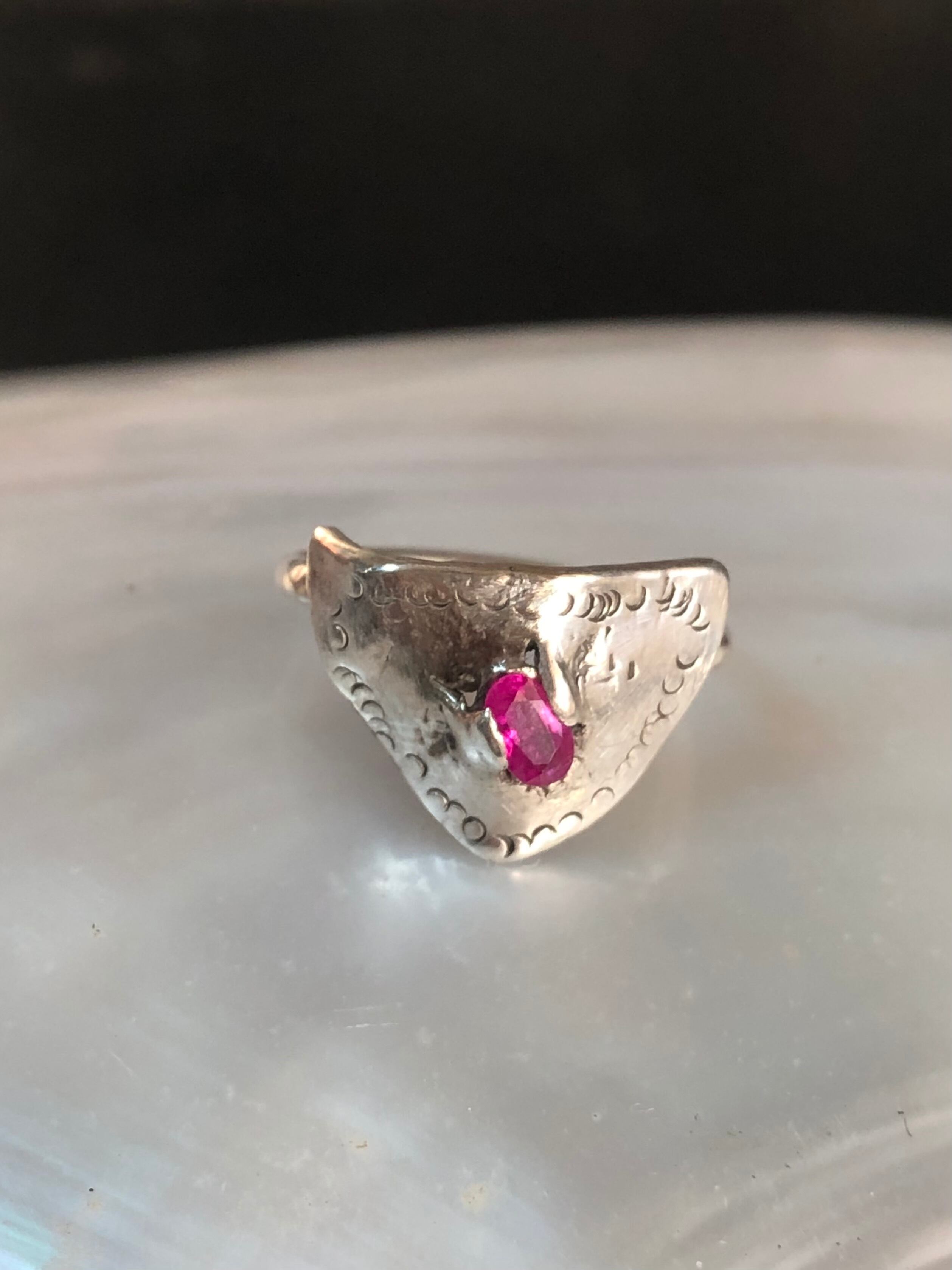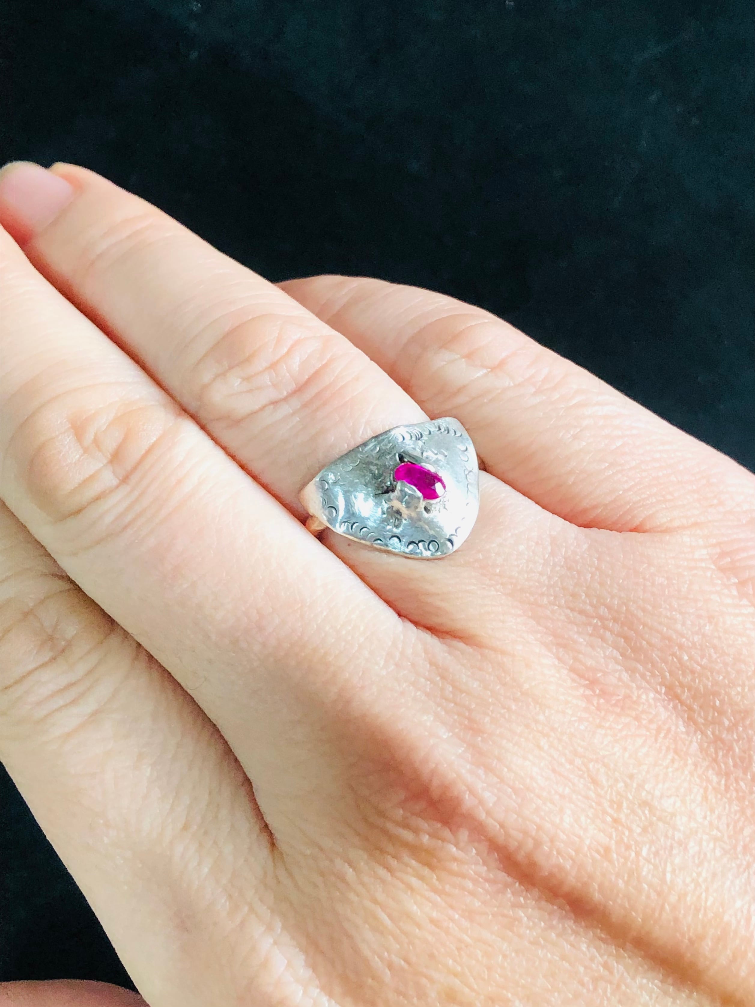鮮やかな赤色のルビーを、silver950,925のリングにセットした、他にはない魅力的なデザインです。ルビーは情熱や愛の象徴とされ、持つ人に力強いエネルギーを与える石として古くから親しまれています。
