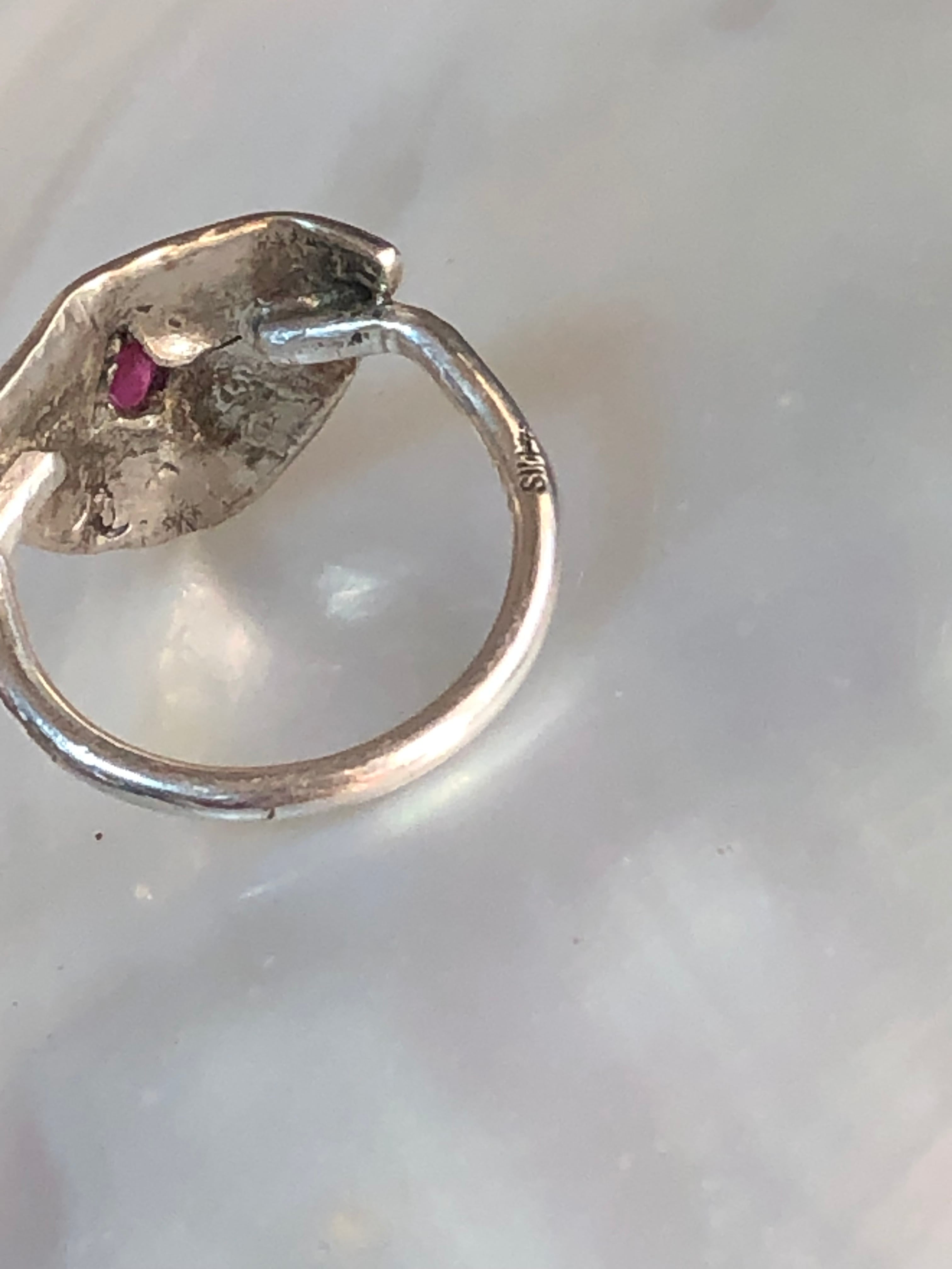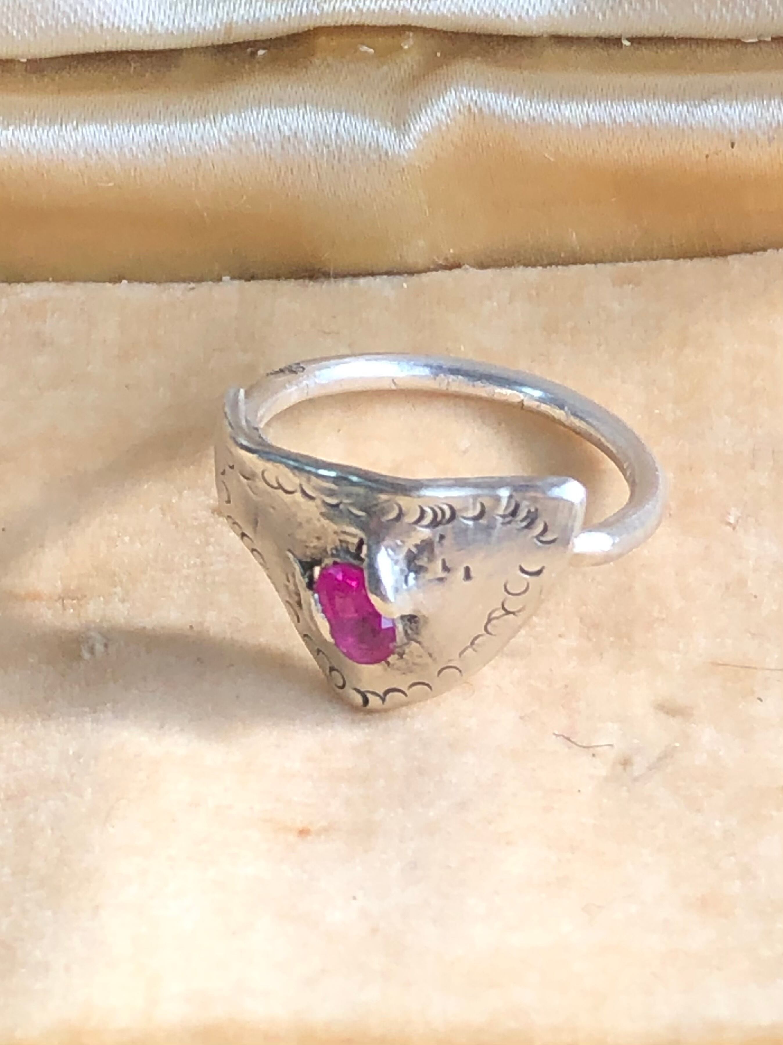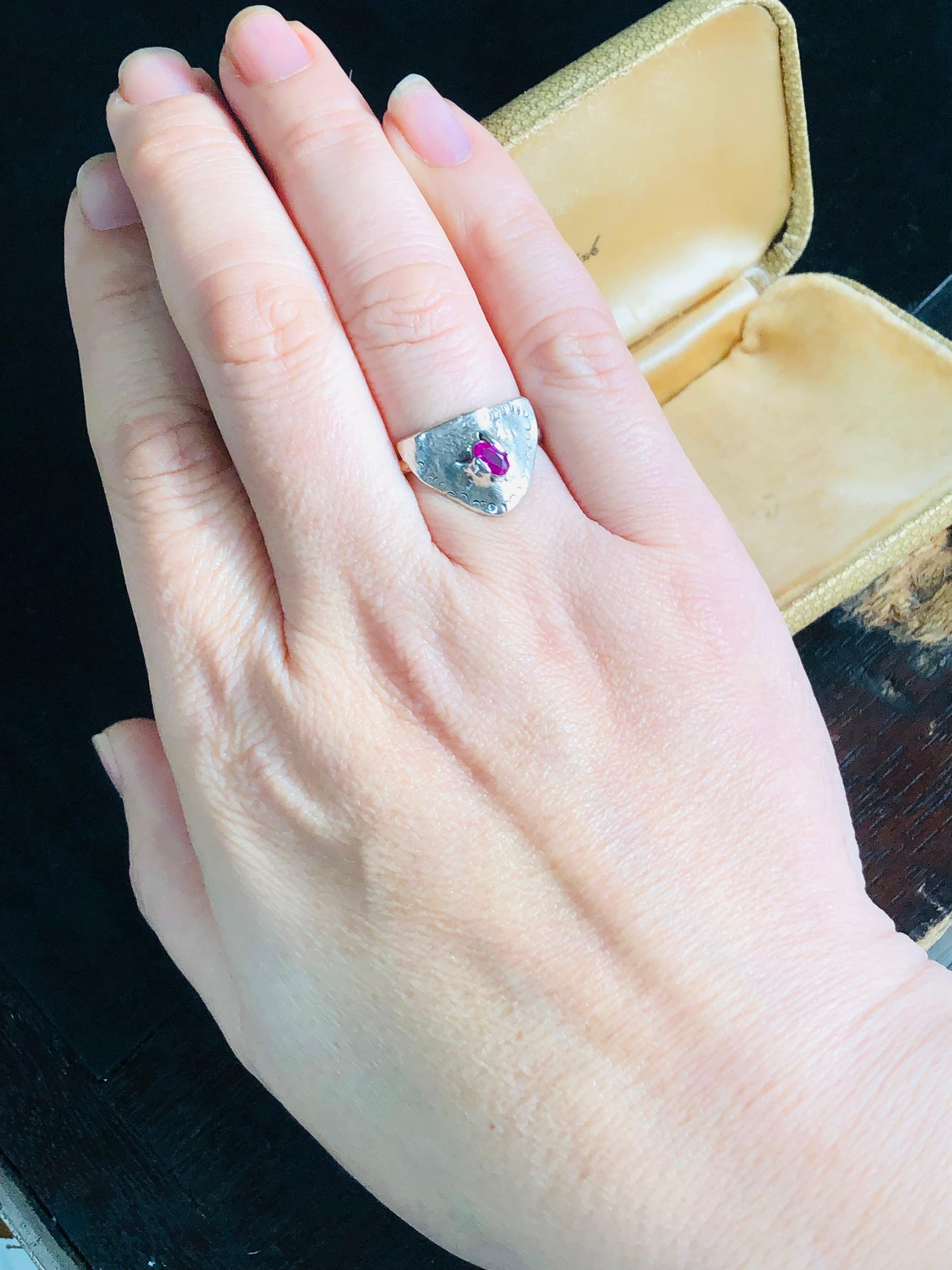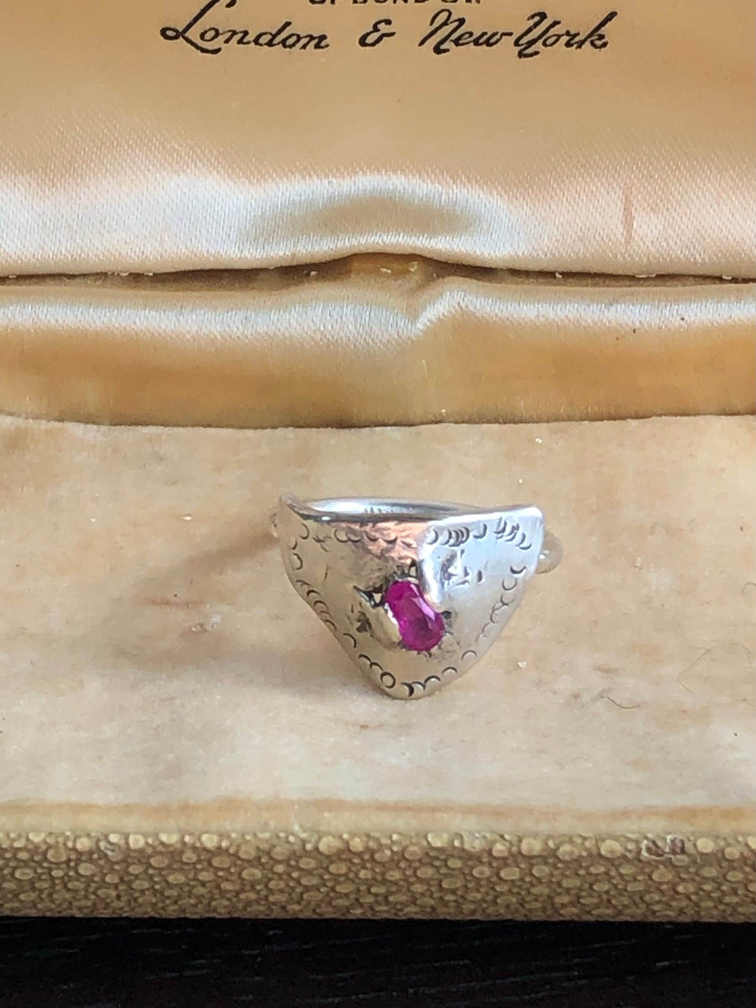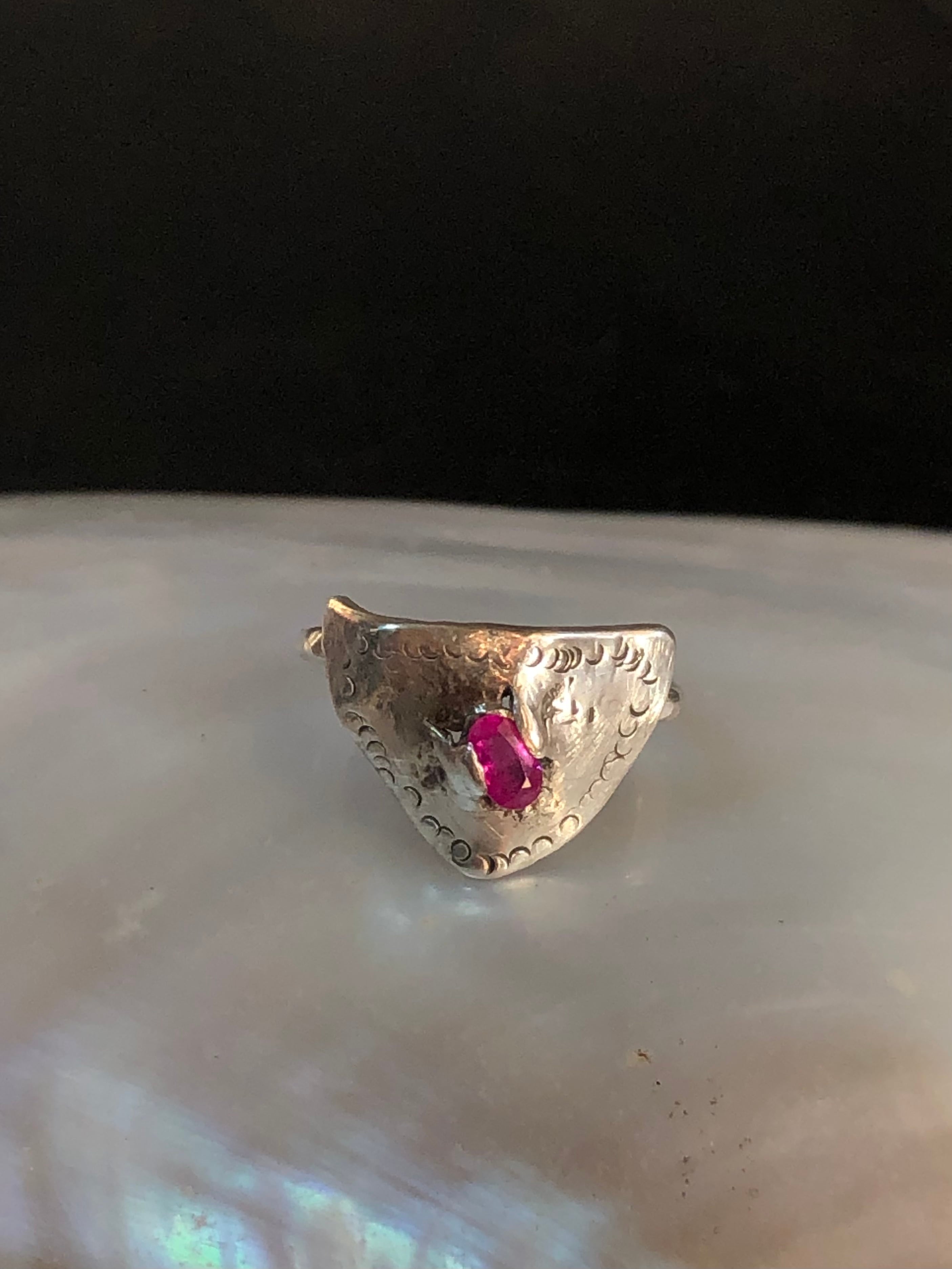 鮮やかな赤色のルビーを、silver950,925のリングにセットした、他にはない魅力的なデザインです。ルビーは情熱や愛の象徴とされ、持つ人に力強いエネルギーを与える石として古くから親しまれています。