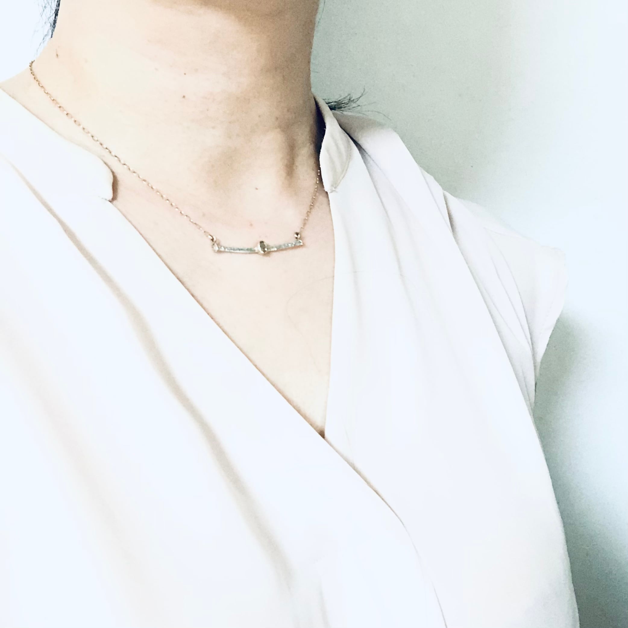手仕事で銀の粉を溶かし付け、テクスチャーを施したシルバーモチーフは光を受けてキラキラと輝きます。チェーンは石枠と同じk10ゴールド。繊細なゴールドと重厚なシルバーのコントラストが新鮮な印象です。首元に沿わせるよう、短めに着けていただくと素敵です。